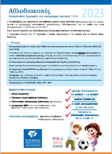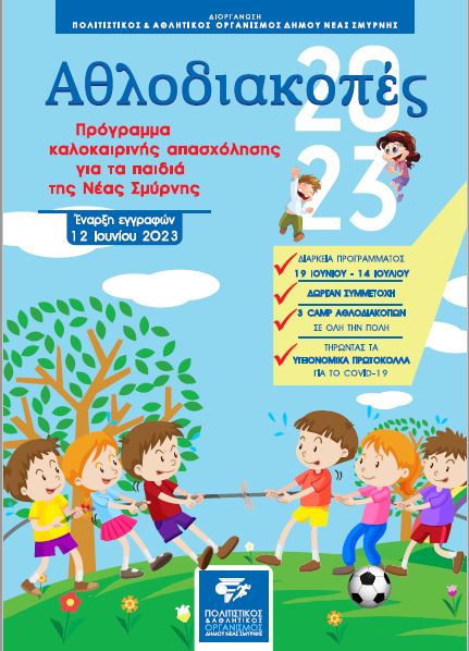Ο Πολιτιστικός & Αθλητικός Οργανισμός του Δήμου Νέας Σμύρνης ανακοινώνει την έναρξη της ηλεκτρονικής υποβολής των αιτήσεων και των απαραίτητων δικαιολογητικών για το πρόγραμμα «Αθλοδιακοπές 2023» τη Δευτέρα 12 Ιουνίου έως και την Πέμπτη 15 Ιουνίου και ώρα 15.00. Αιτήσεις οι οποίες αποστέλλονται μετά την προαναφερθείσα ημέρα και ώρα θεωρούνται εκπρόθεσμες και δεν θα γίνονται δεκτές. Το πρόγραμμα θα πραγματοποιηθεί από 19 Ιουνίου έως και 14 Ιουλίου, για παιδιά γεννημένα από 01.01.2010 έως 31-12-2017.