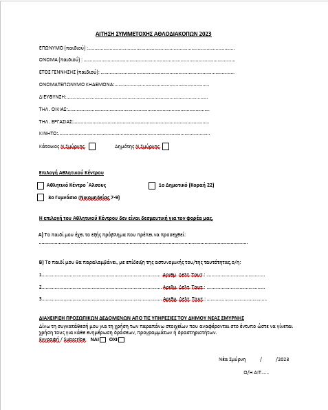 Η κατάθεση των αιτήσεων και όλων των δικαιολογητικών γίνεται ΜΟΝΟ ηλεκτρονικά στο email: athlodiakopes@neasmyrni.gr.