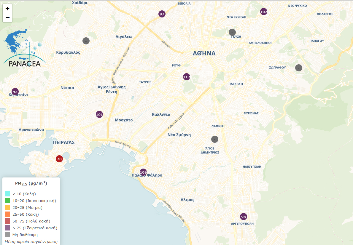 Άσχημη είναι σήμερα η κατάσταση της ατμόσφαιρας στο Λεκανοπέδιο Αττικής, όσον αφορά τα επιβλαβή αιωρούμενα και εισπνεόμενα σωματίδια PM2.5 (με διάμετρο έως
